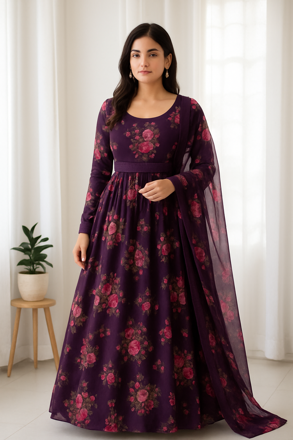 This Is A Women’s Floral And Printed Long Dress Collection, Designed For Elegance. The Collection Features Flowy, Floor-Length Anarkali Dresses And Kurtas, Made With Lightweight, Breathable Fabrics—Perfect For Festive Occasions, Casual Outings, Or Daily Wear.